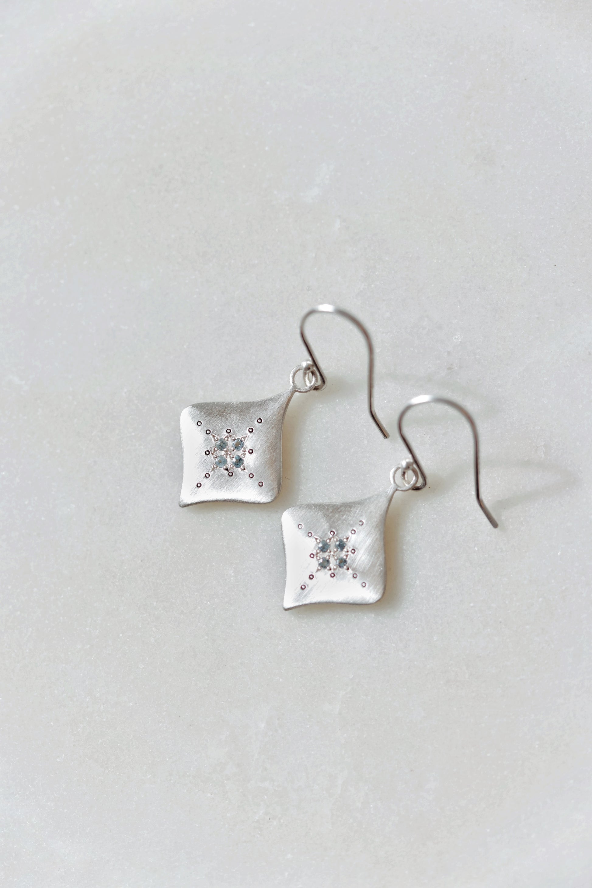 Beautifully shaped sterling silver earrings set with a cluster of four aquamarine.