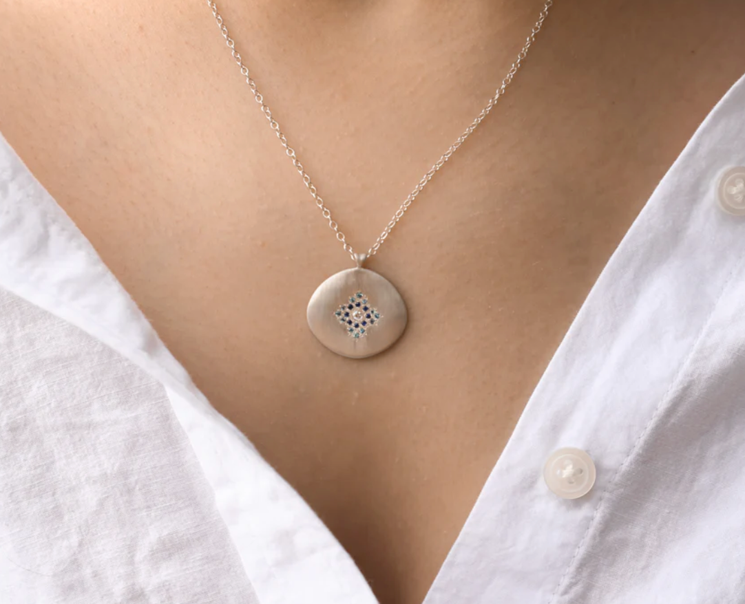 Reminiscent of a cluster of stars. This silver pendant is set with aquamarines, blue sapphires and a diamond center.