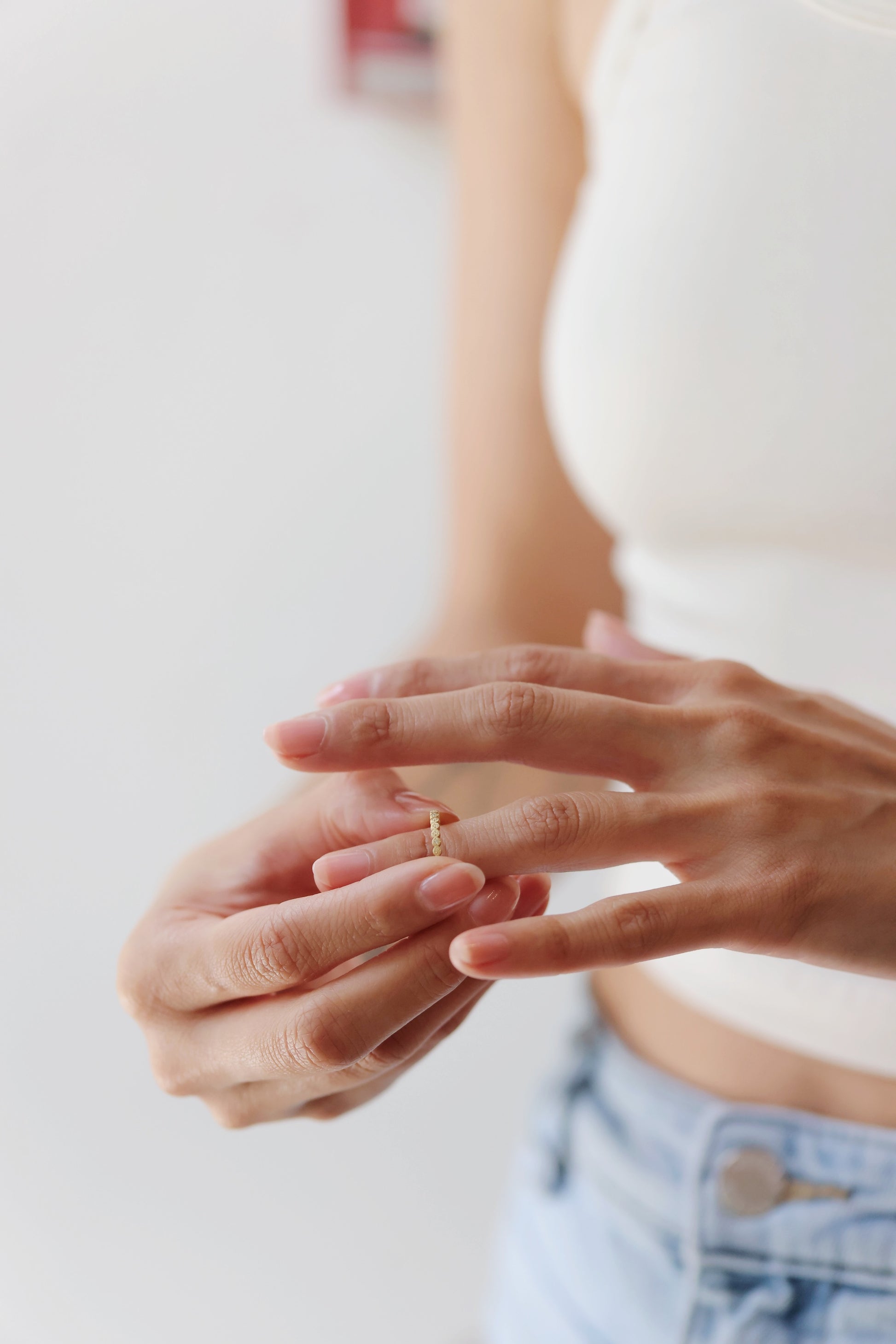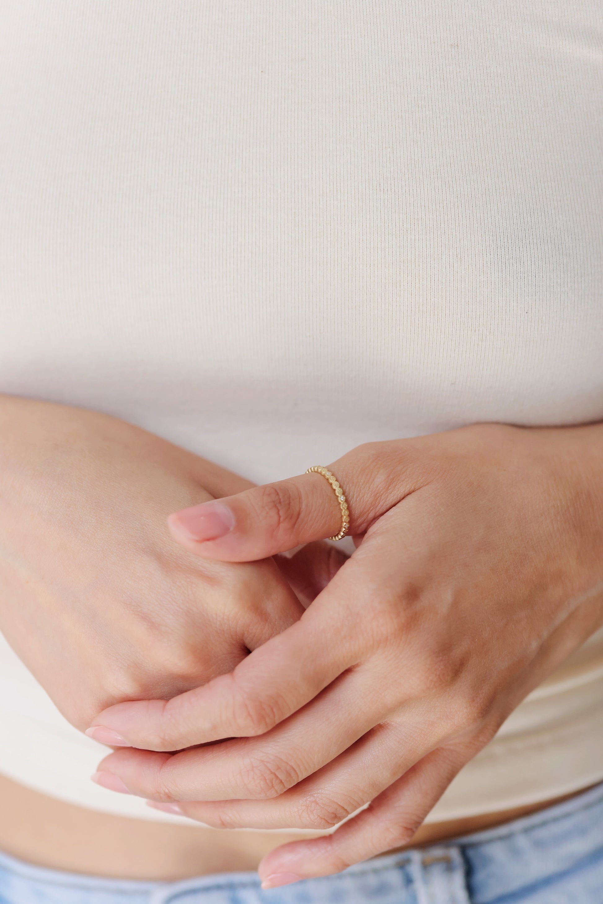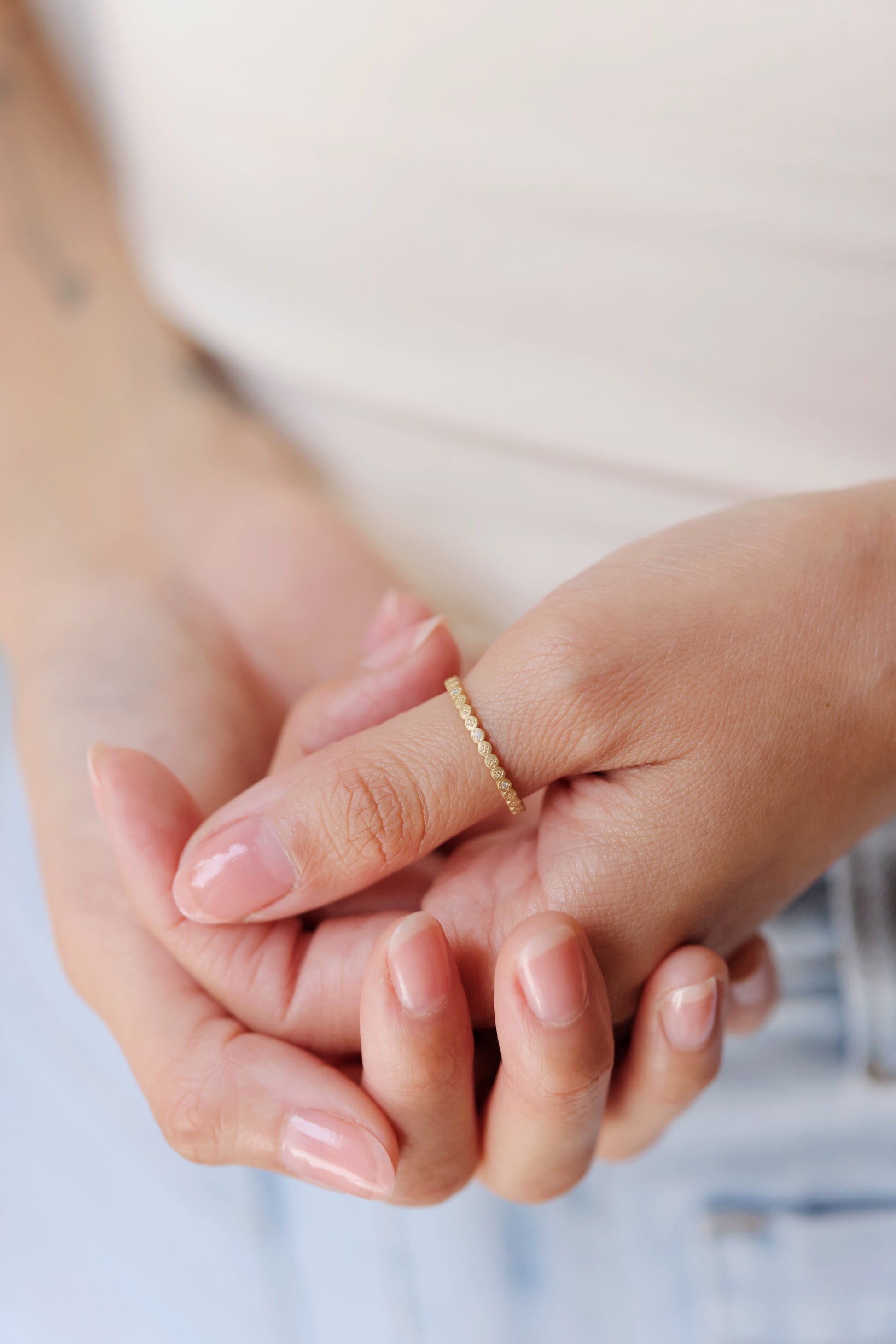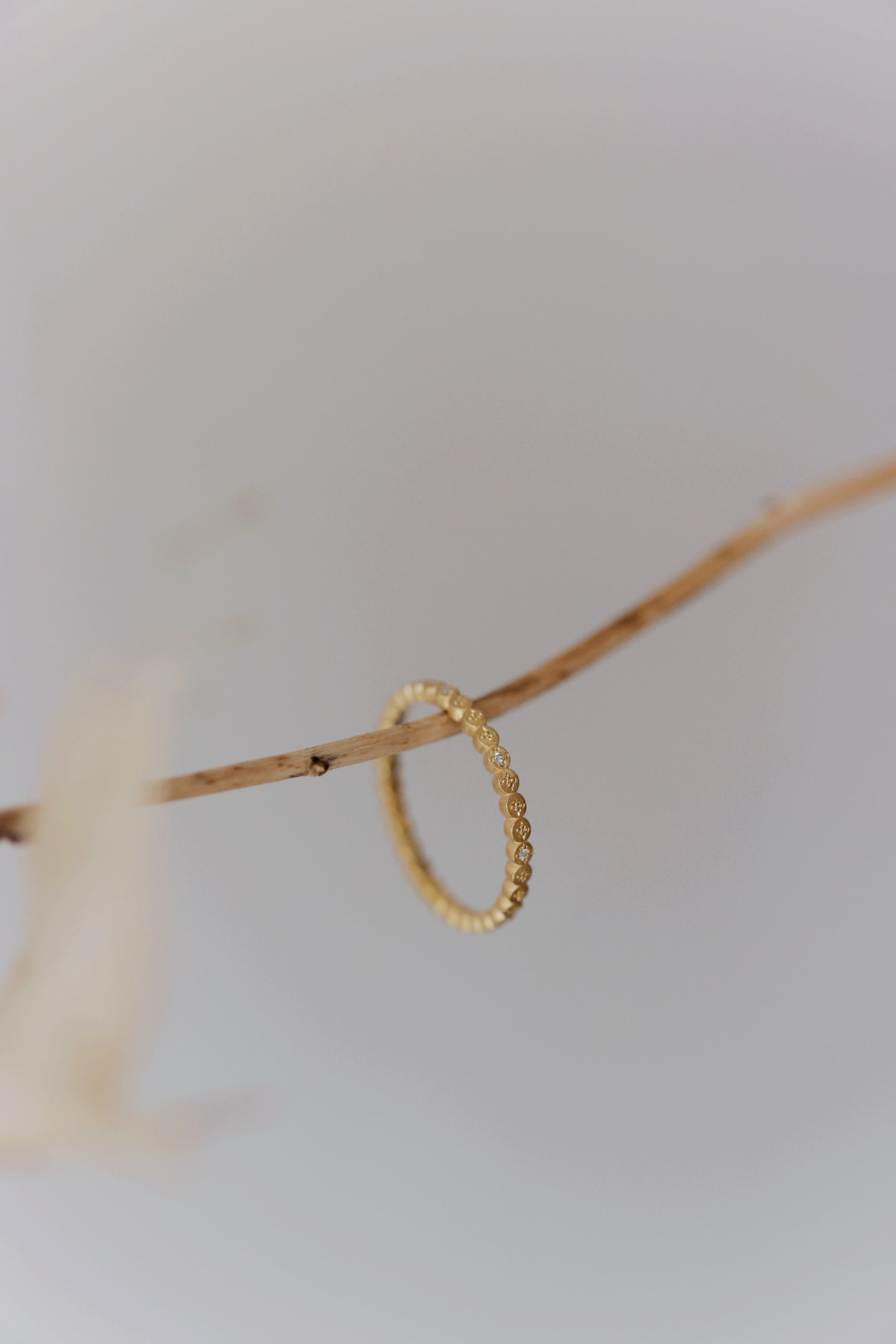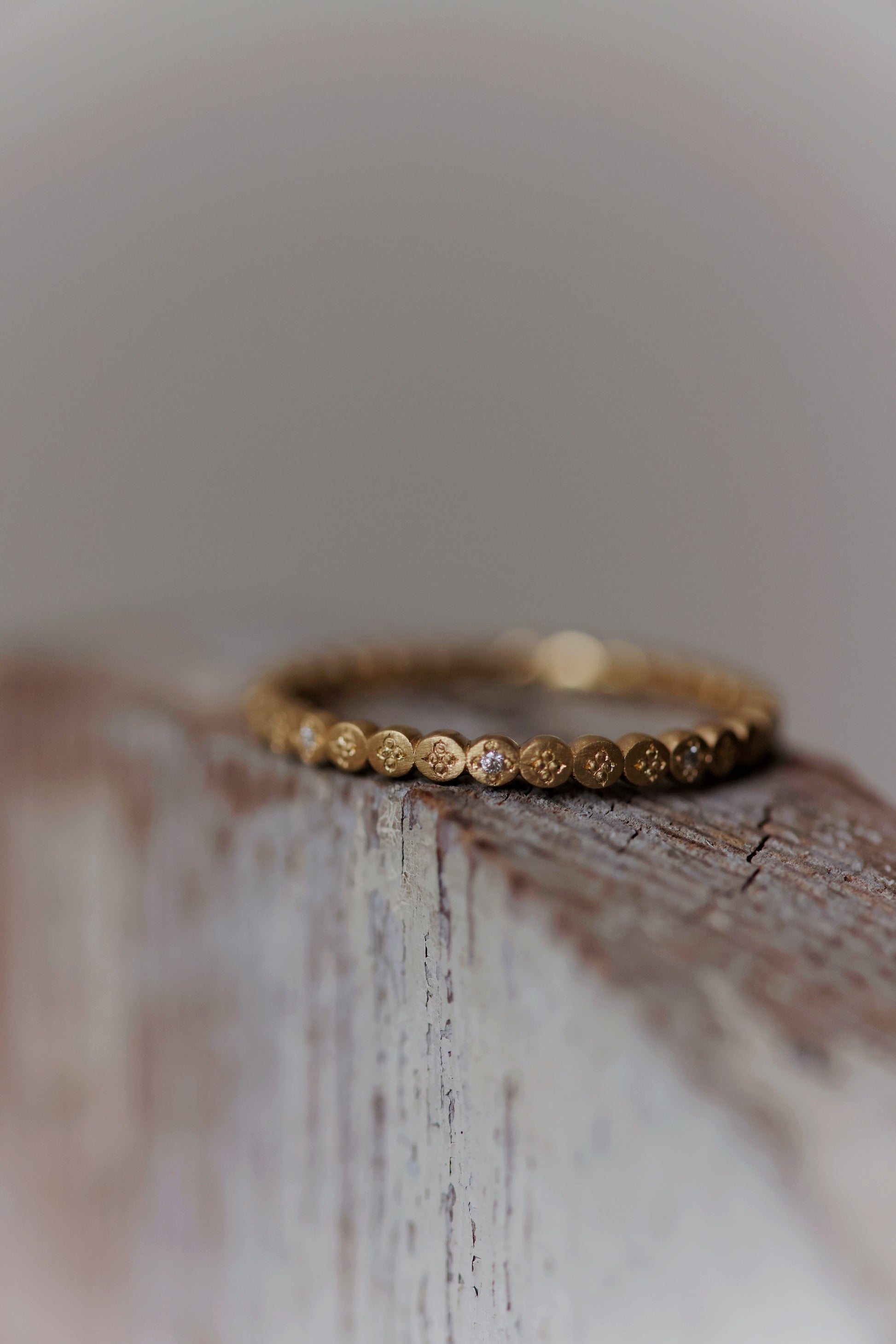 Reminiscent of smooth river rocks, the individual circles on this 18K yellow gold wedding band are hand-soldered together to represent unity and continuity. Each circle is studded with either a bead set diamond or a hand engraving. A satin finish on the gold presents a pleasing contrast to the ongoing sparkle. Size: 7, otherwise made to order.