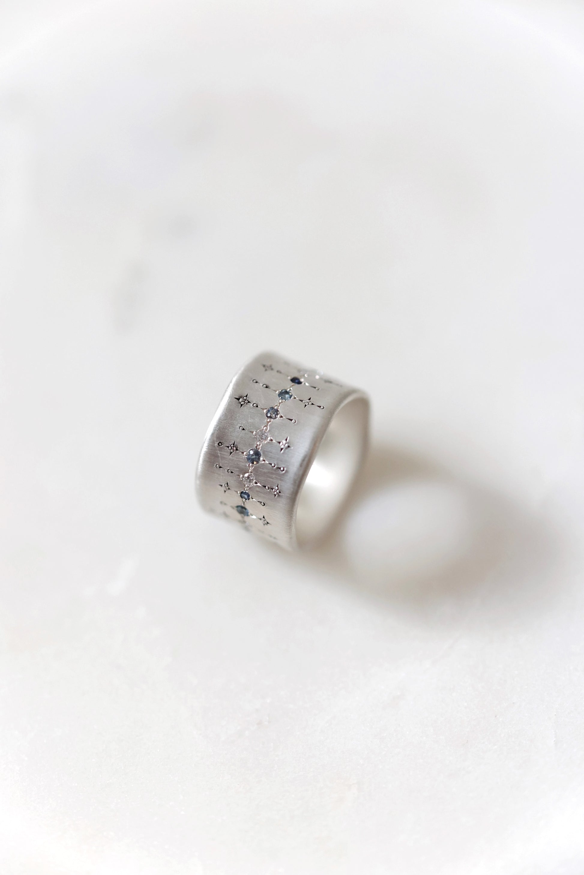 Adel Chefridi - Wide Silver Band with single stone line patter in sapphire, aquamarine, and diamond