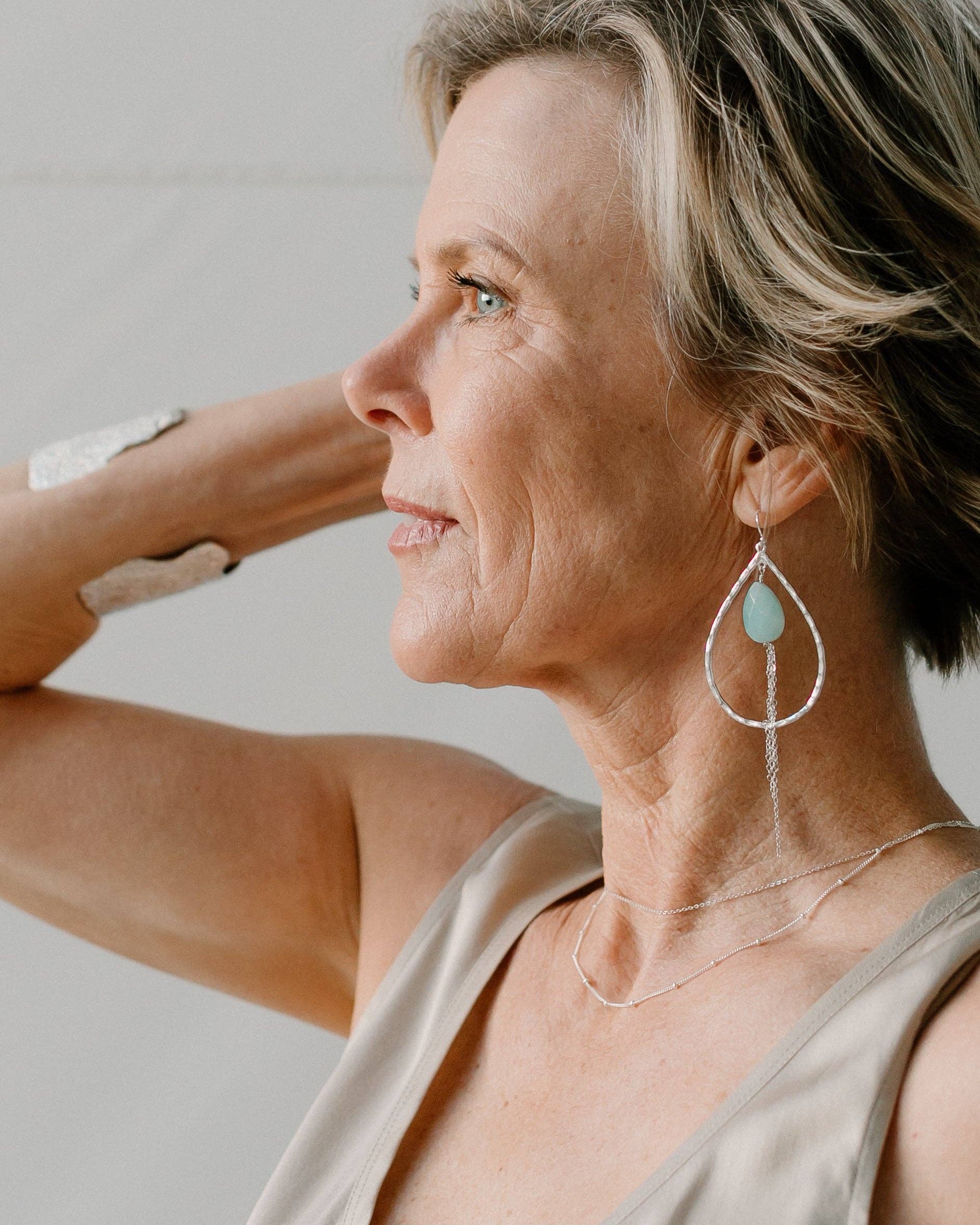 * Earrings are hypoallergenic - hooks are 14-karat gold-filled or sterling silver and are made in the US * Non-toxic - there's no nickel, cadmium, or lead in Laura Elizabeth jewelry * This pale blue stone is amazonite * Length of teardrop pendant is approximately 1.5 inches * Teardrop earring is made of 100% recycled brass & 14 karat-gold/sterling silver plated * Teardrop earrings are sustainably and ethically made * Chain is made in the US * Earrings are handmade in the US