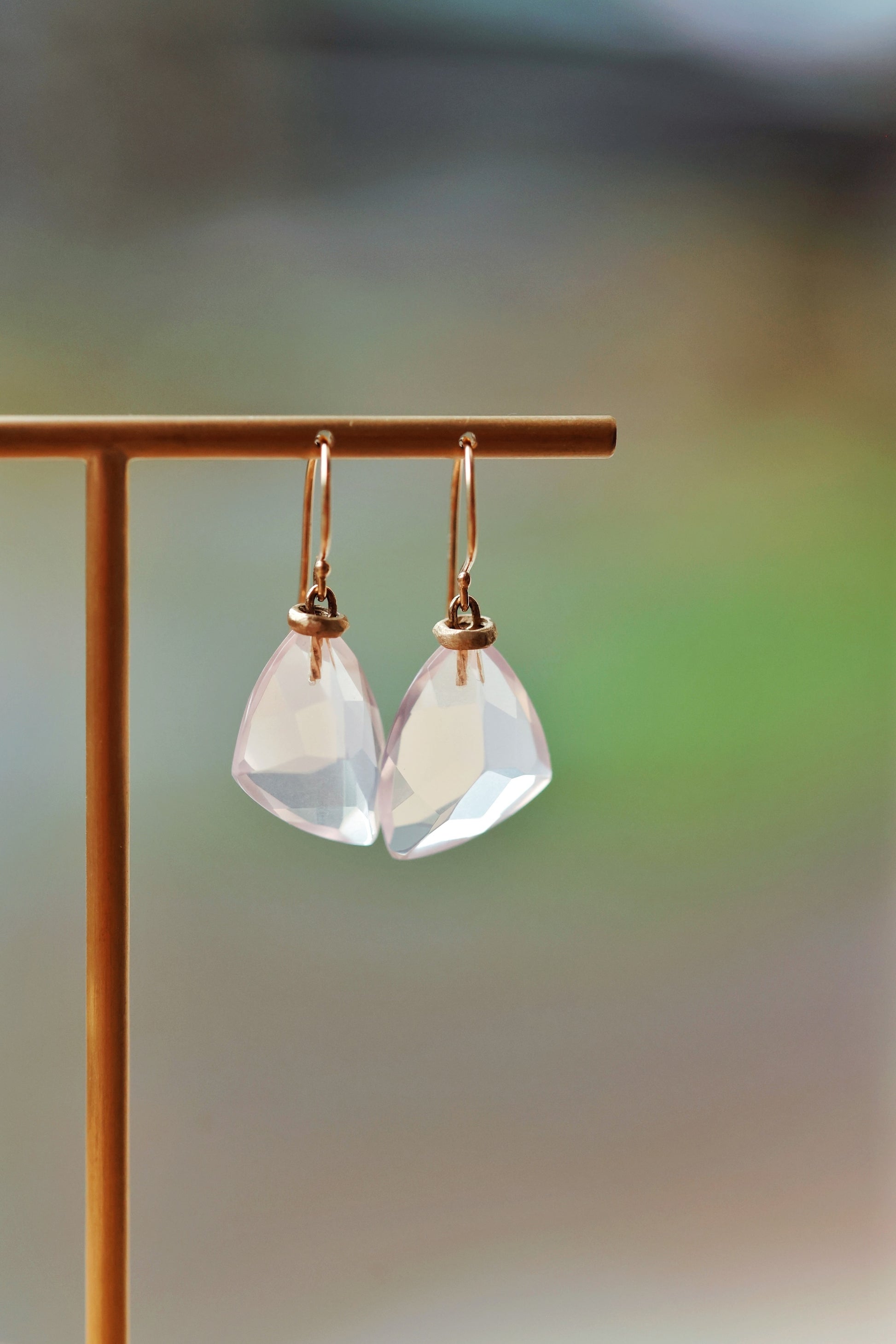 14K Gold Earrings w/ Small Asymmetrical Faceted ROSE QUARTZ & Single Organic Ring