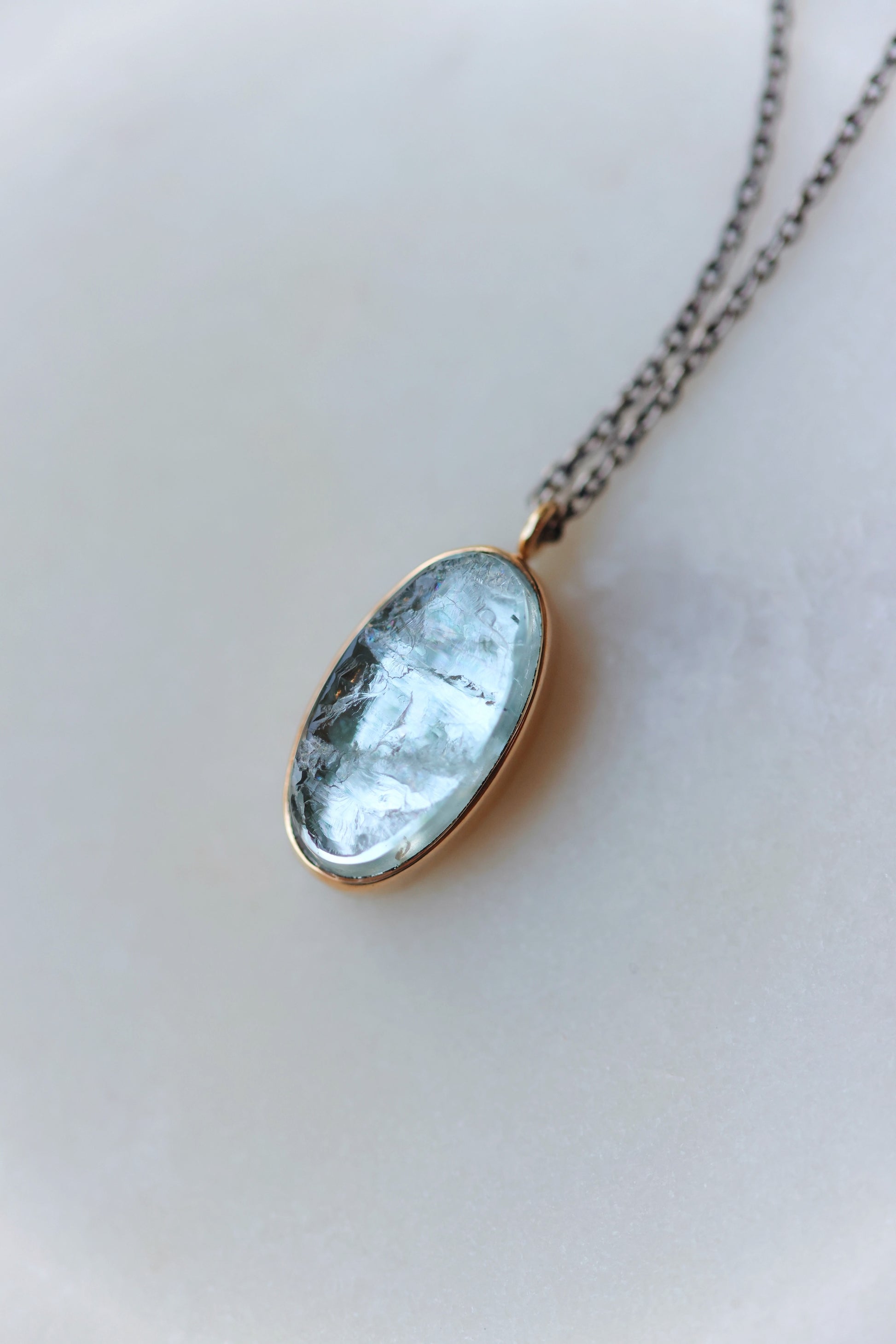 Oxidized Sterling & 14K Gold Necklace w/ Oval Surface Cut AQUAMARINE in Sterling Backed Gold Bezel w/ .03 ct Diamond Accent (18")