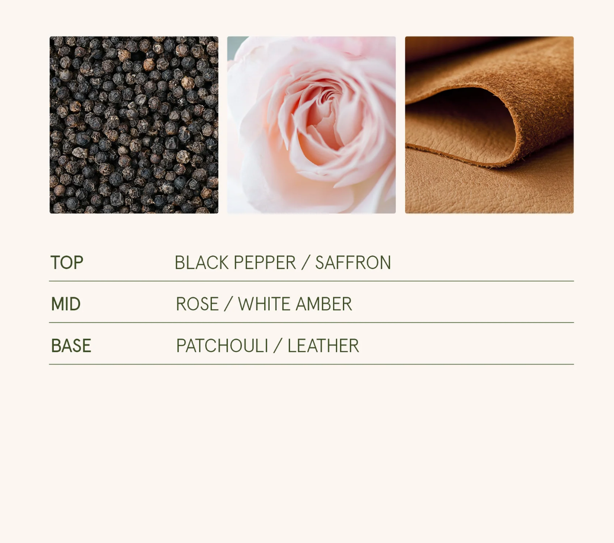 Top:Black pepper, Saffron | Middle: Rose, White Amber | Base: Patchouli, Leather.