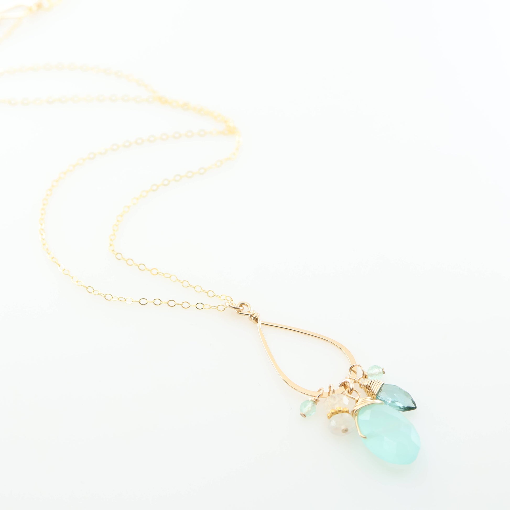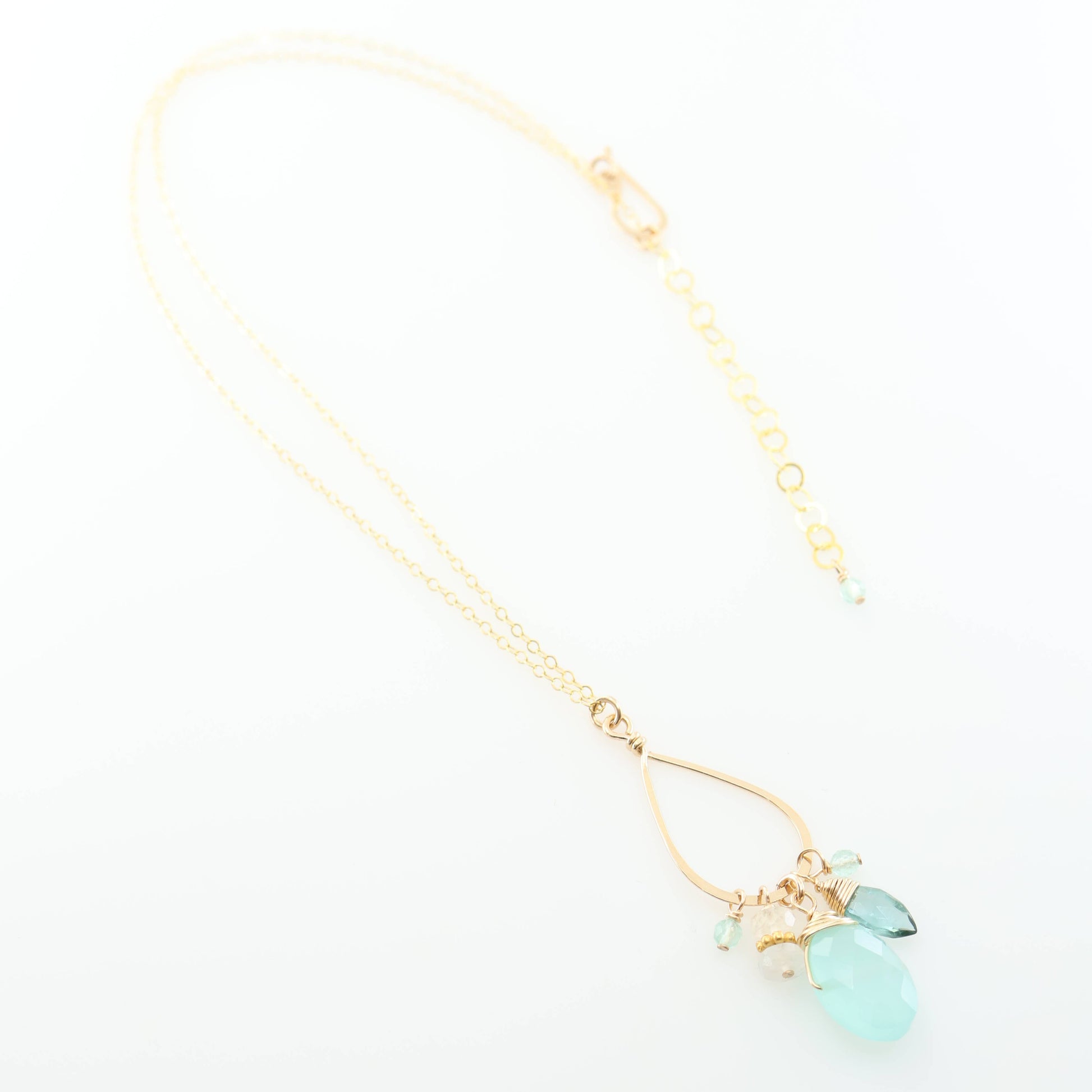 Another everyday favorite of J. Mills, revamped with new stones for spring! This necklace is one that you rarely take off. The simple, larger forged teardrop pendant is as versatile as the woman wearing it. Accented with hand-wrapped Aqua Chalcedony Oval, stack of Rainbow Moonstone, marquis cut Aquamarine, and tiny Aqua Chalcedony rondelles.