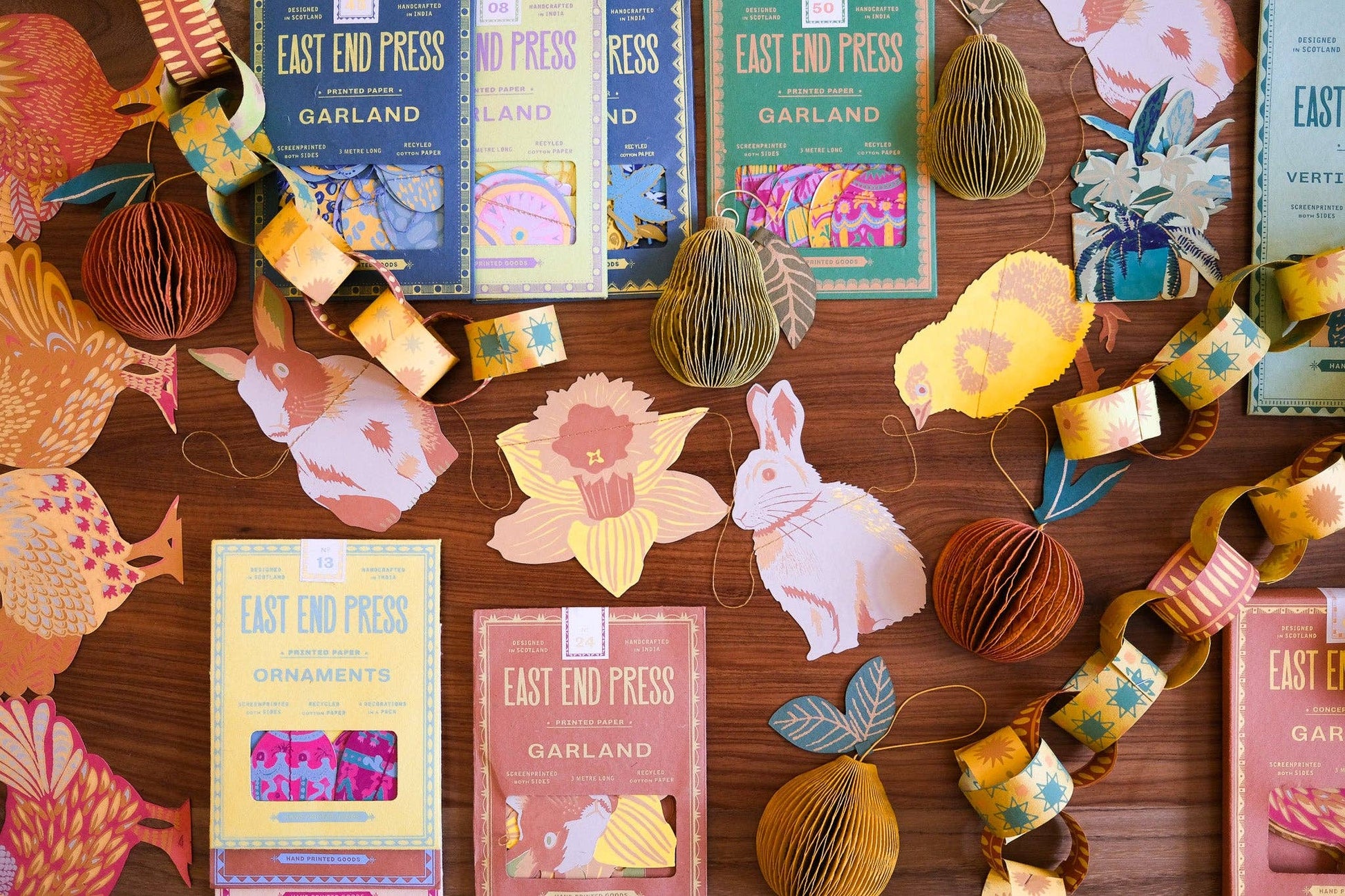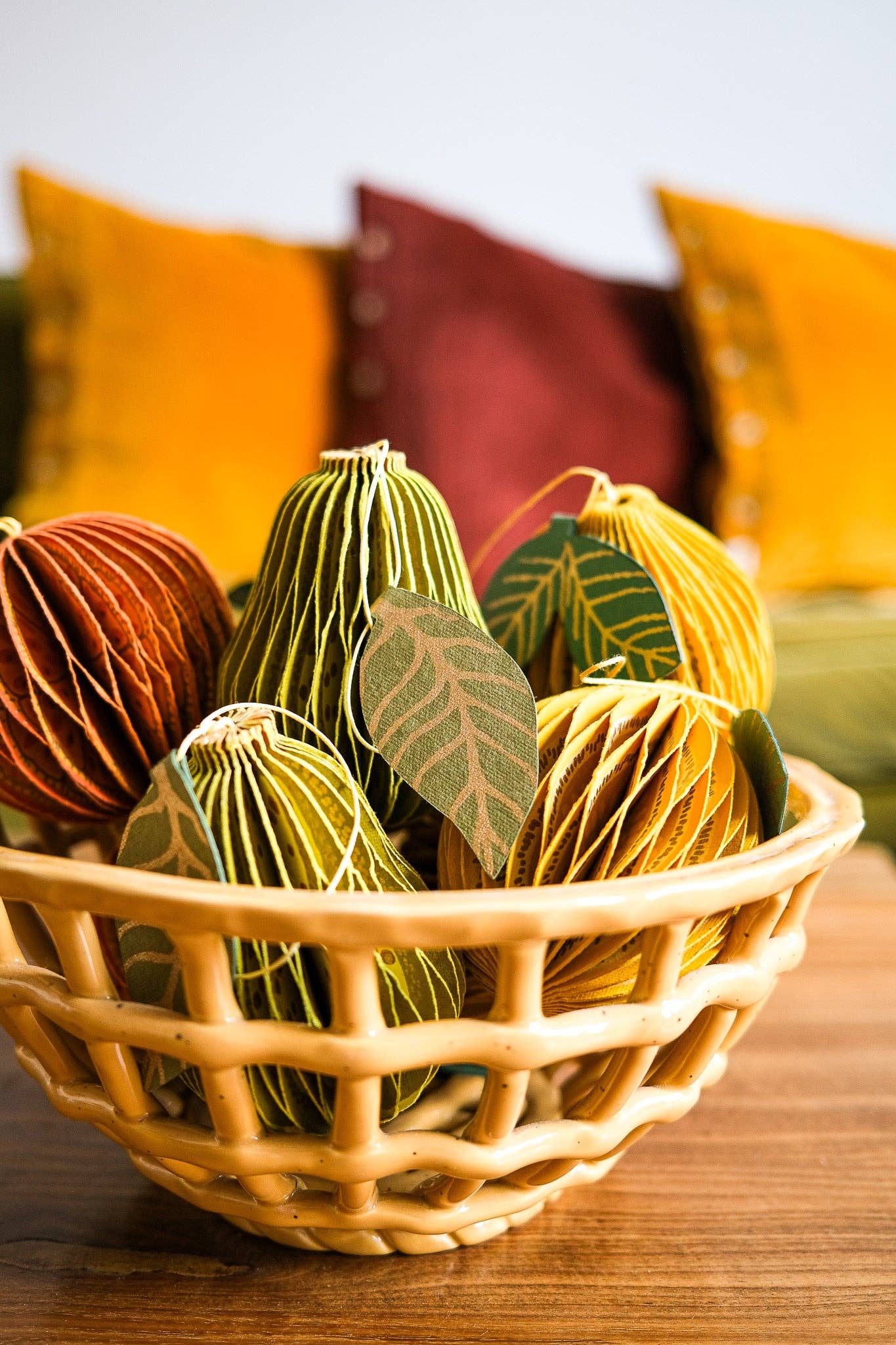 Composed of intricate layers of recycled cotton paper, each decoration unfolds to reveal a three-dimensional honeycomb pear.