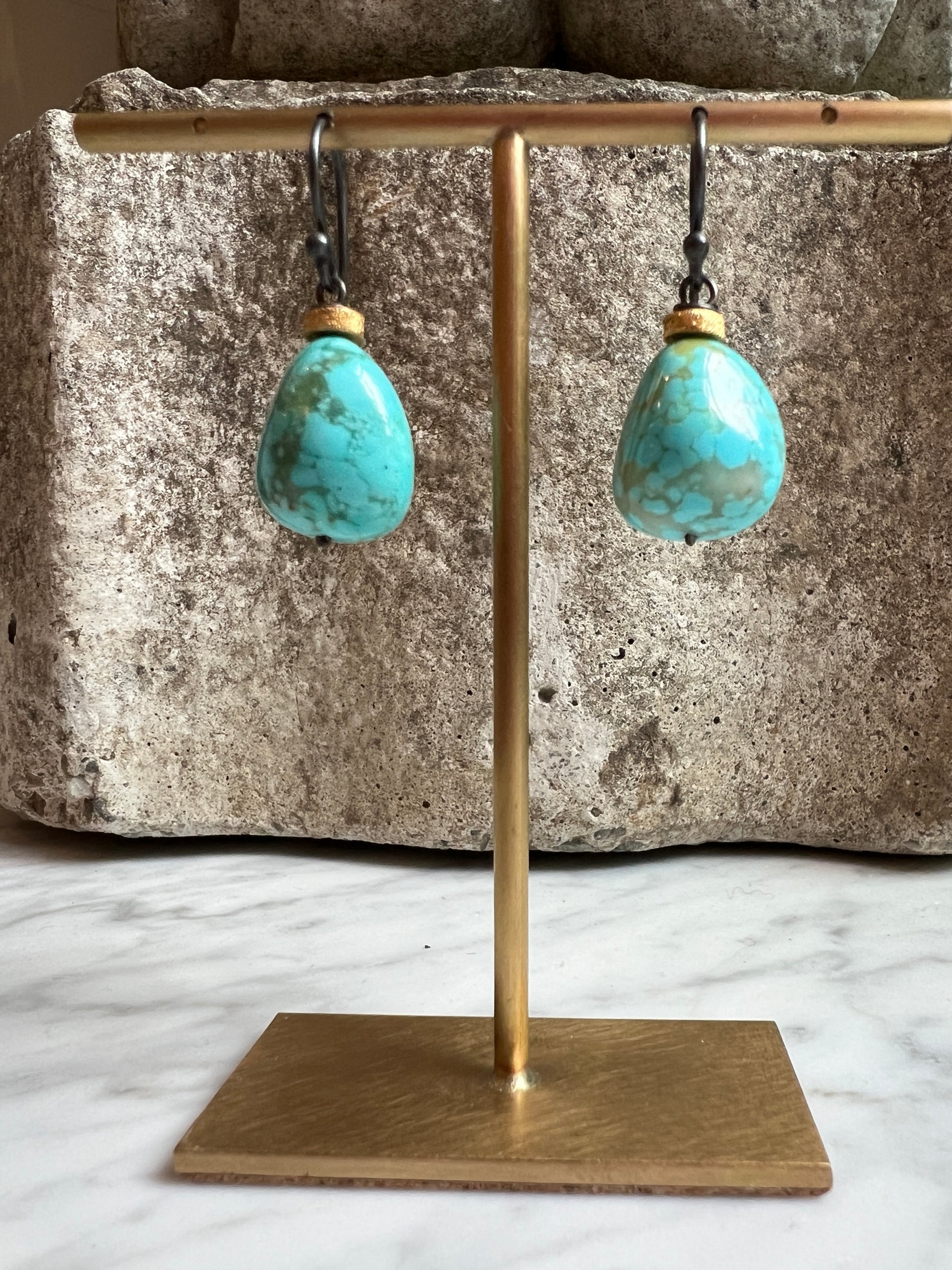 Polished Nevada turquoise with handmade golden bead halos. Their organic shape makes each pair one of a kind. 24 karat gold over sterling silver and oxidized silver french hooks. 1 1/2"