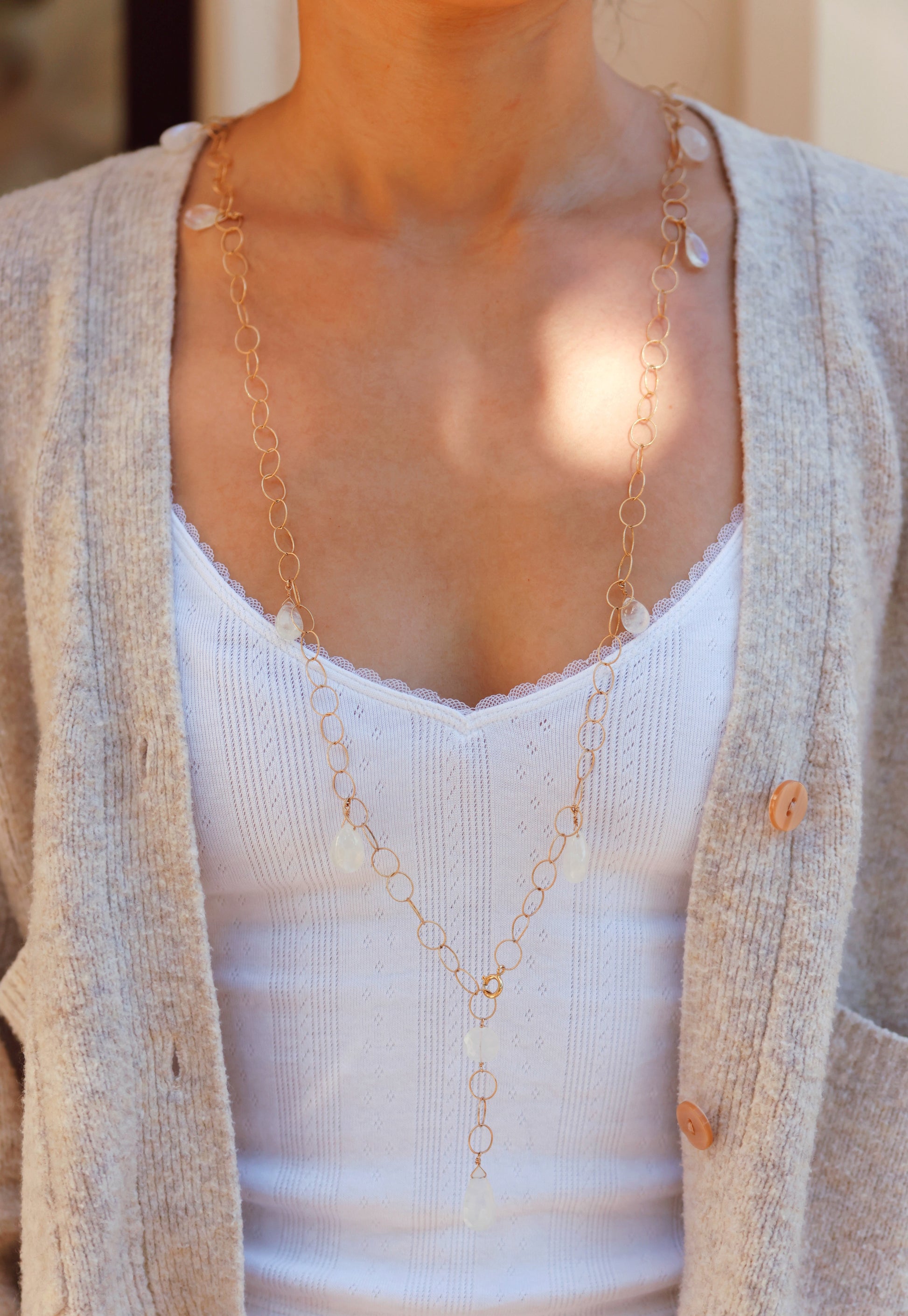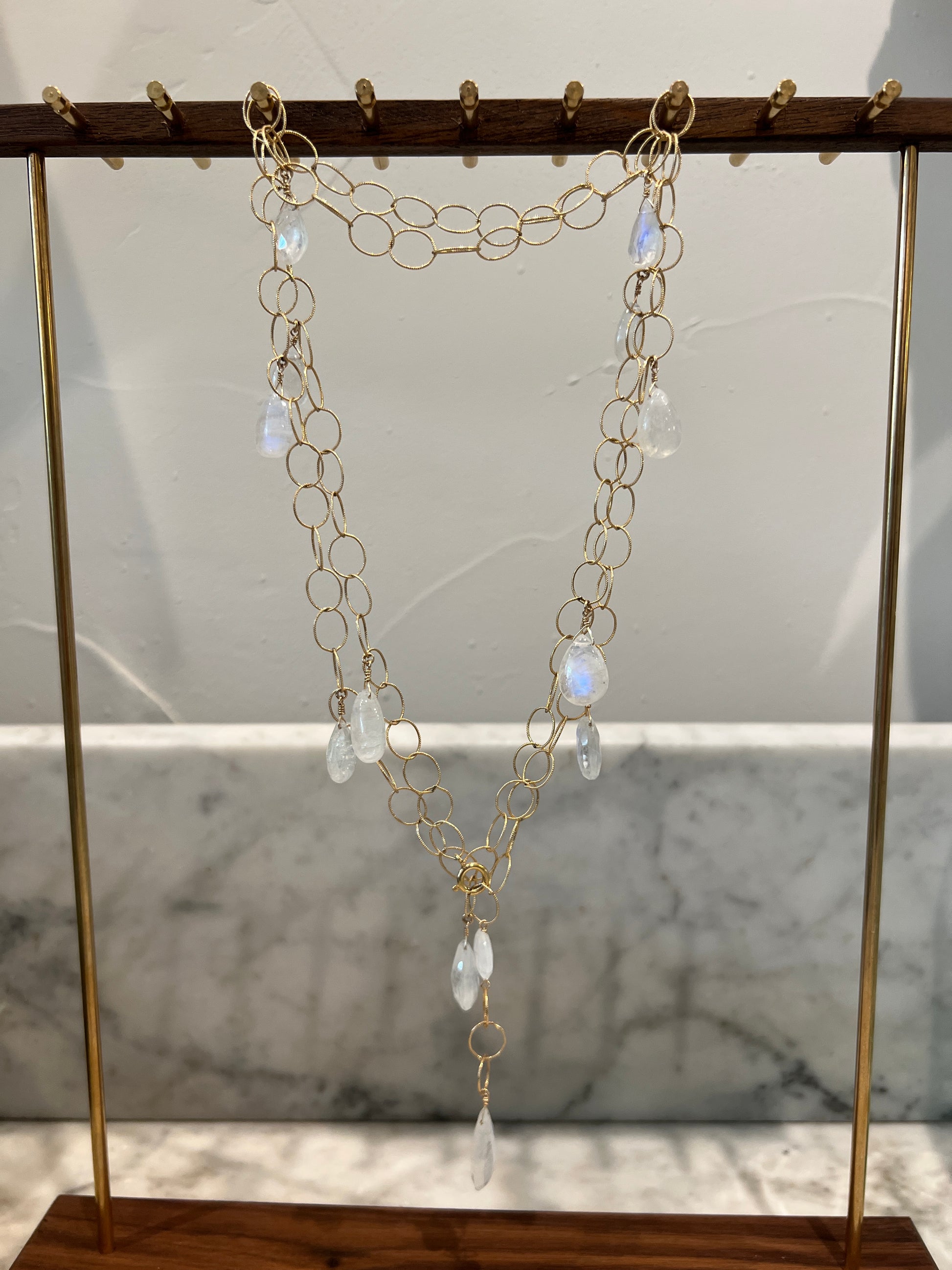 Rainbow Moonstone multi-stone open chain lariat on 14K gold fill chain and wires